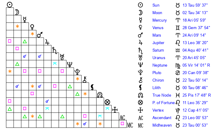 | Moon | 2 Taurus 31 | 16 Leo 8 | 25 Virgo 22 |