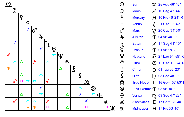 | Mercury | 10 Pisces 46 | 2 Pisces 13 | 21 Gemini 0 |