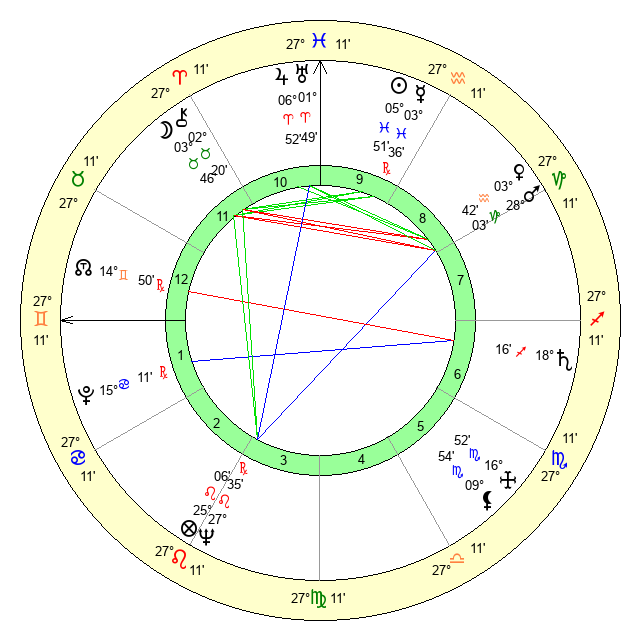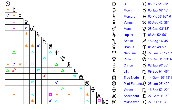 | Sun | 5 Pisces 52 | 7 Pisces 20 | 10 Gemini 55 |
