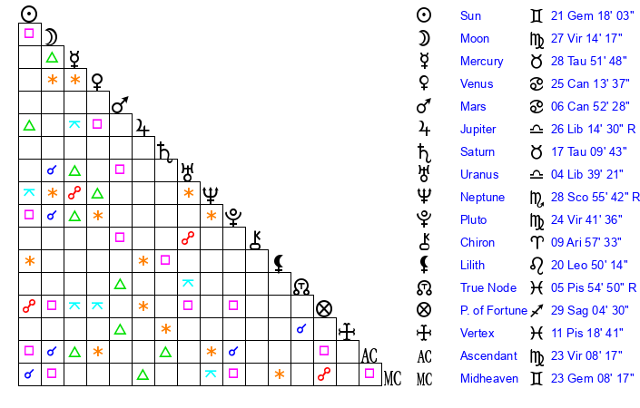 | Moon | 27 Virgo 6 | 7 Capricorn 55 | 2 Libra 13 |