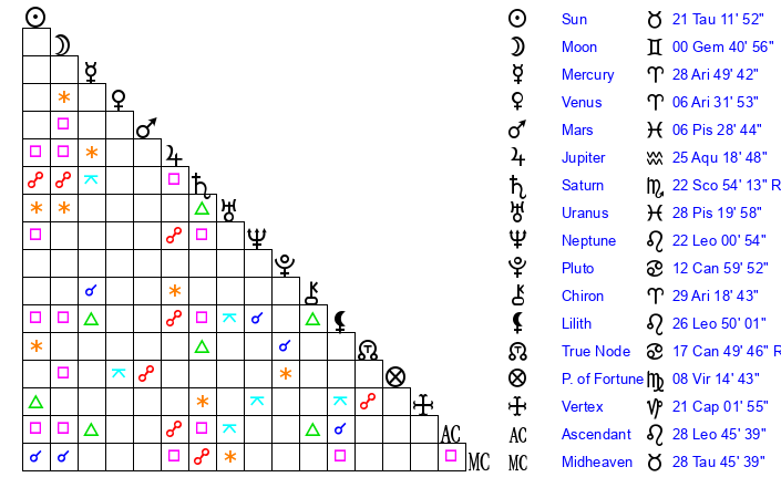 | Saturn | 23 Scorpio 26 | 28 Pisces 52 | 20 Scorpio 27 |