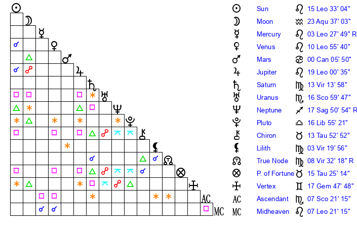 | Saturn | 13 Virgo 35 | 1 Aries 14 | 19 Virgo 15 |