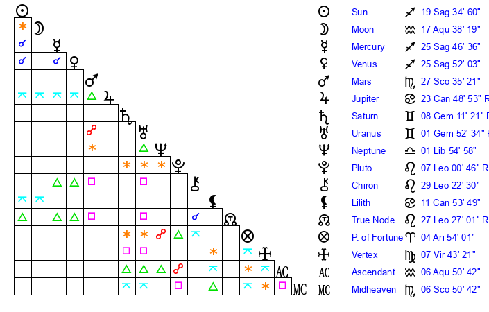 | Mercury | 25 Sagittarius 47 | 7 Sagittarius 34 | 19 Aquarius 37 |
