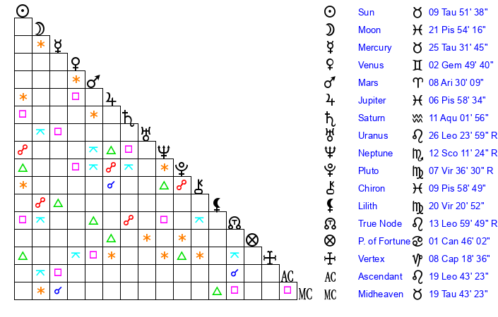 | Moon | 22 Pisces 1 | 21 Gemini 21 | 18 Cancer 45 |
