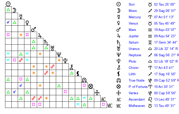 | Neptune | 6 Sagittarius 55 | 0 Aries 49 | 5 Sagittarius 35 |