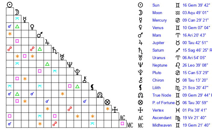 | Mars | 16 Aries 21 | 24 Leo 40 | 20 Gemini 20 |