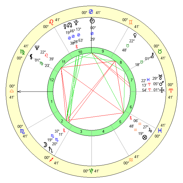 | Sun | 0 Cancer 30 | 1 Cancer 31 | 5 Libra 47 |