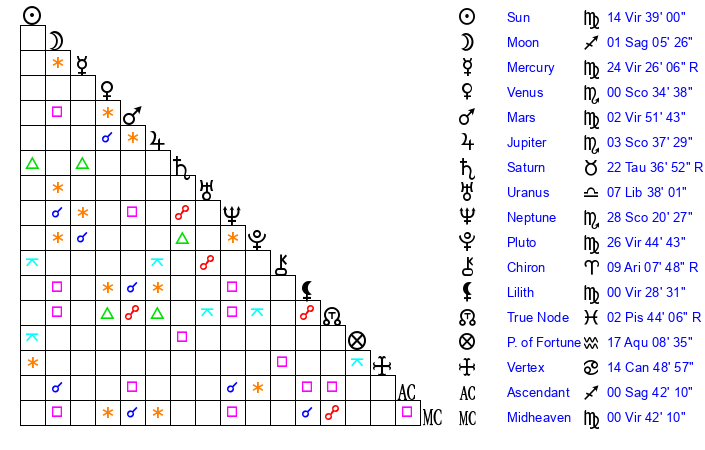 | Sun | 14 Virgo 39 | 15 Virgo 19 | 8 Scorpio 51 |
