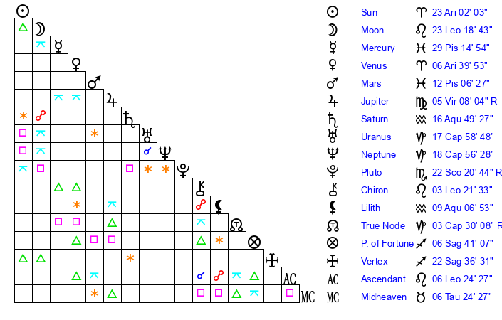 | Sun | 23 Aries 2 | 23 Aries 2 | 25 Taurus 6 |