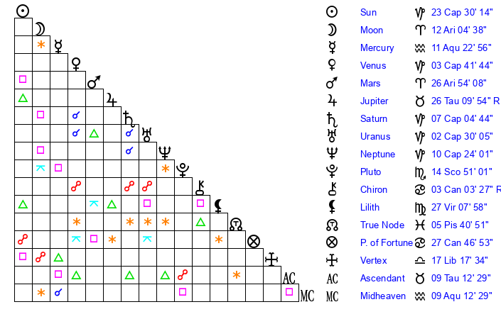 | Sun | 23 Capricorn 30 | 23 Capricorn 46 | 0 Pisces 1 |