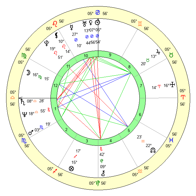 | Moon | 16 Virgo 9 | 19 Leo 48 | 0 Gemini 36 |