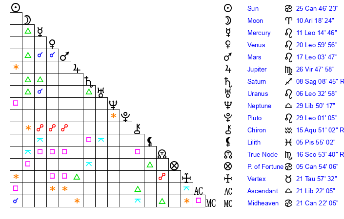 | Venus | 21 Leo 0 | 15 Gemini 44 | 12 Scorpio 15 |