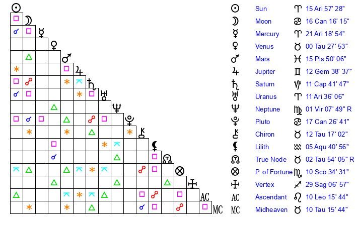 Moon | 16 Cancer 24 | 4 Leo 4 | 13 Capricorn 40 |