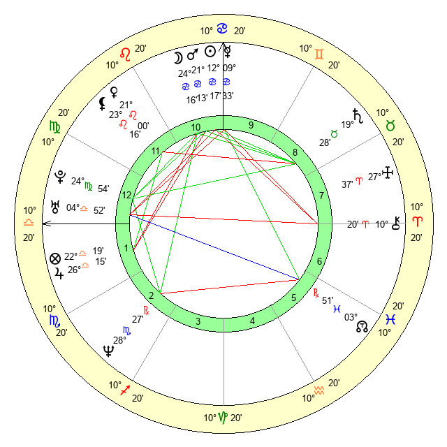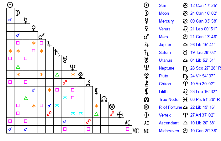 | Moon | 24 Cancer 10 | 3 Scorpio 40 | 0 Leo 10 |