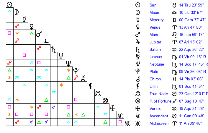 | Neptune | 14 Scorpio 16 | 1 Aries 14 | 12 Scorpio 58 |