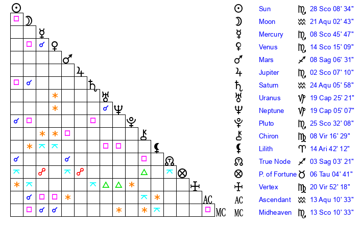 | Pluto | 25 Scorpio 32 | 0 Aquarius 0 | 26 Scorpio 43 |