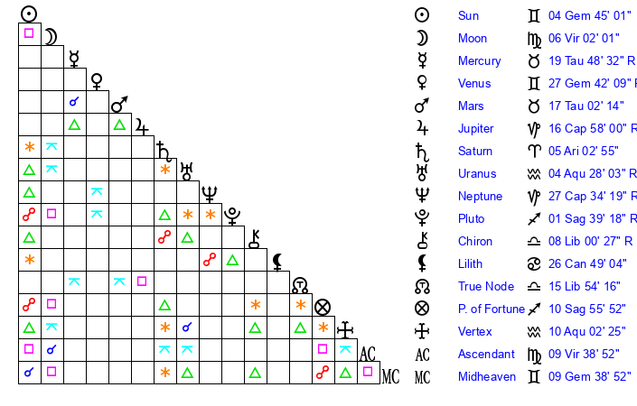 | Sun | 4 Gemini 45 | 4 Gemini 44 | 2 Cancer 29 |