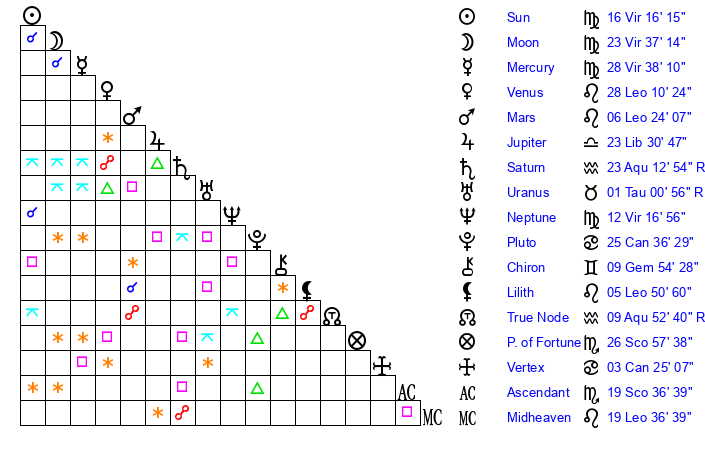 | Sun | 16 Virgo 16 | 17 Virgo 13 | 16 Sagittarius 54 |
