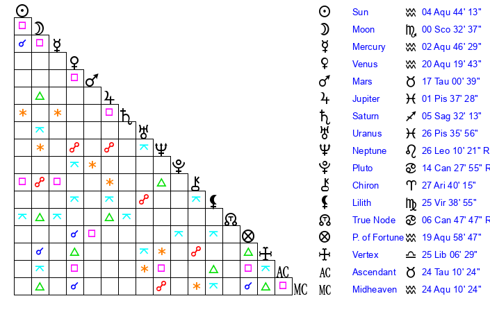 | Moon | 0 Scorpio 27 | 18 Sagittarius 48 | 12 Gemini 4 |
