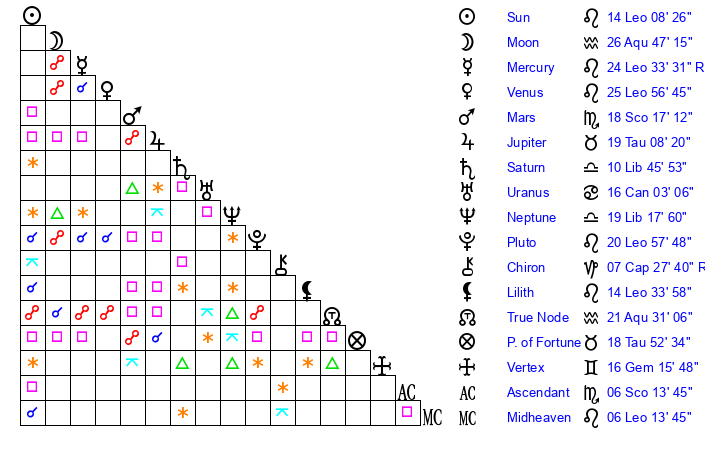 | Pluto | 20 Leo 58 | 2 Aquarius 17 | 22 Leo 56 |