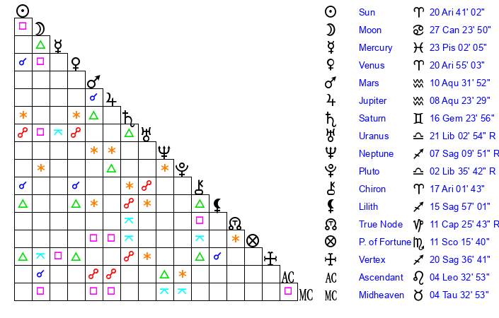 | Sun | 20 Aries 40 | 21 Aries 4 | 11 Gemini 2 |