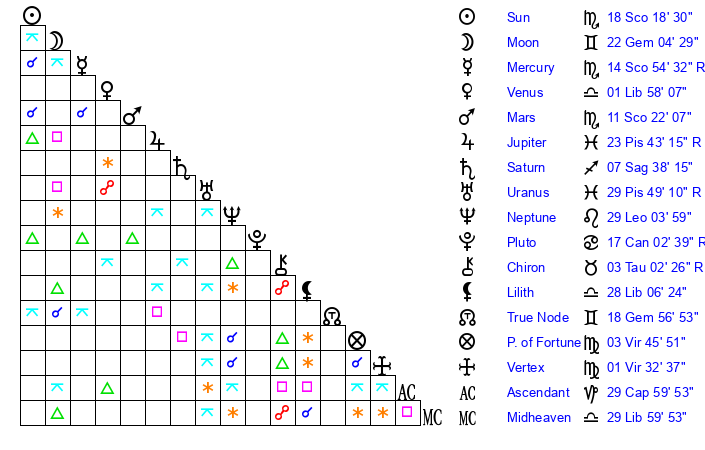 | Sun | 18 Scorpio 19 | 19 Scorpio 33 | 27 Aquarius 48 |