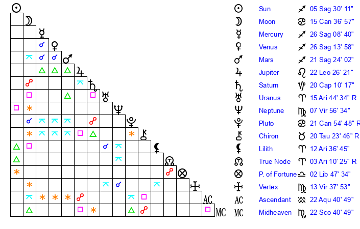 | Sun | 5 Sagittarius 30 | 6 Sagittarius 43 | 10 Pisces 55 |