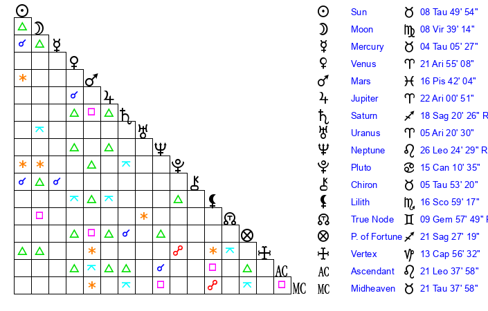 | Sun | 8 Taurus 50 | 9 Taurus 21 | 11 Leo 45 |