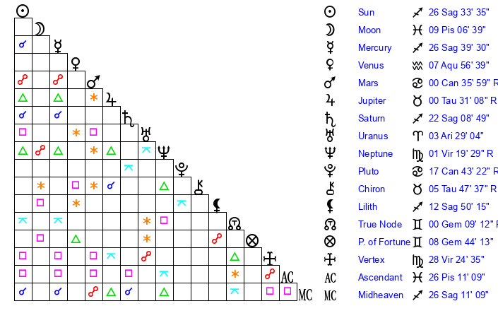 | Sun | 26 Sagittarius 34 | 27 Sagittarius 1 | 4 Aries 34 |