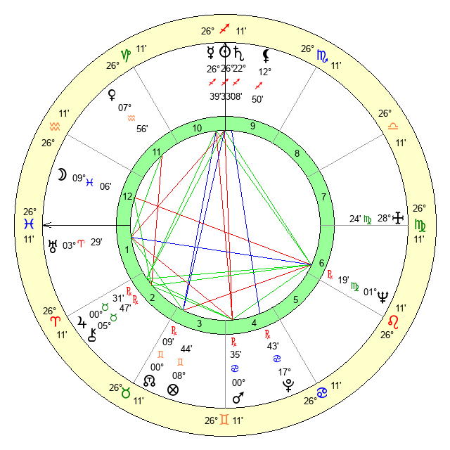 | Neptune | 1 Virgo 20 | 29 Pisces 23 | 29 Leo 7 |