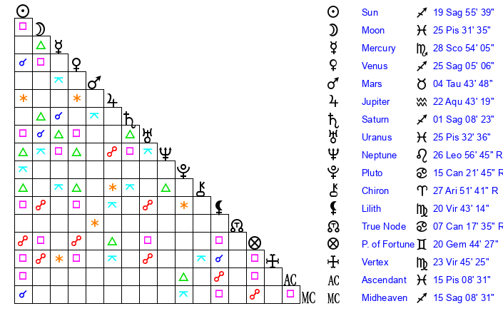 | Saturn | 1 Sagittarius 33 | 25 Pisces 15 | 8 Sagittarius 5 |
