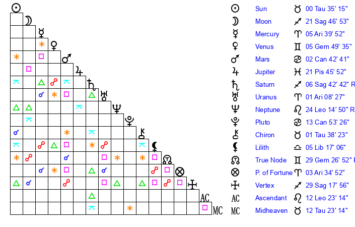 | Sun | 0 Taurus 35 | 1 Taurus 50 | 4 Leo 36 |