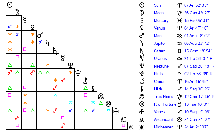 | Saturn | 15 Gemini 36 | 24 Pisces 1 | 20 Gemini 59 |