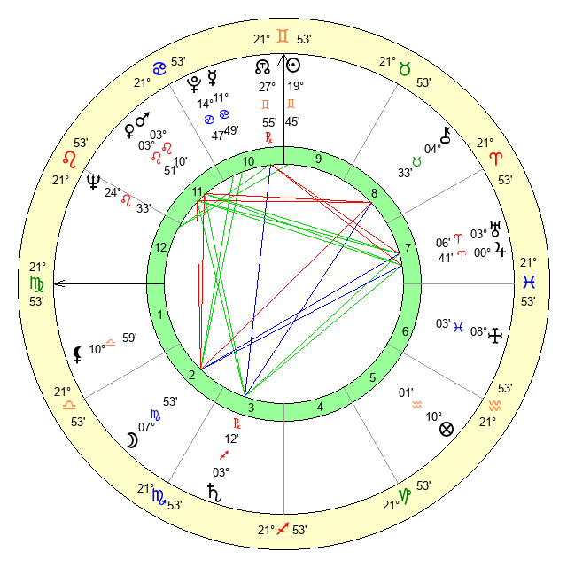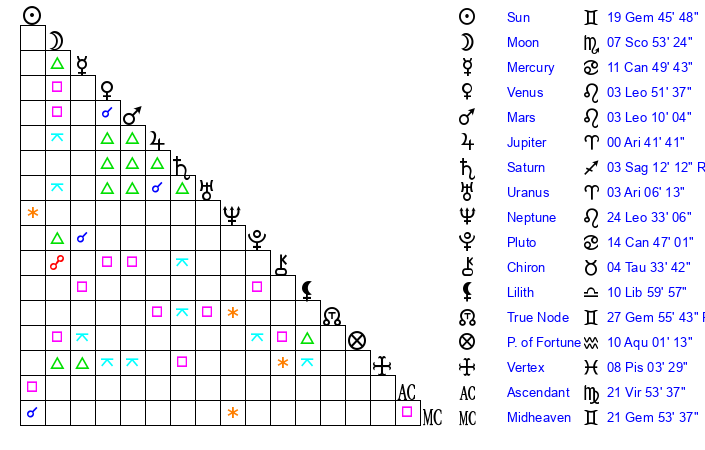 | Sun | 19 Gemini 46 | 21 Gemini 1 | 23 Virgo 48 |