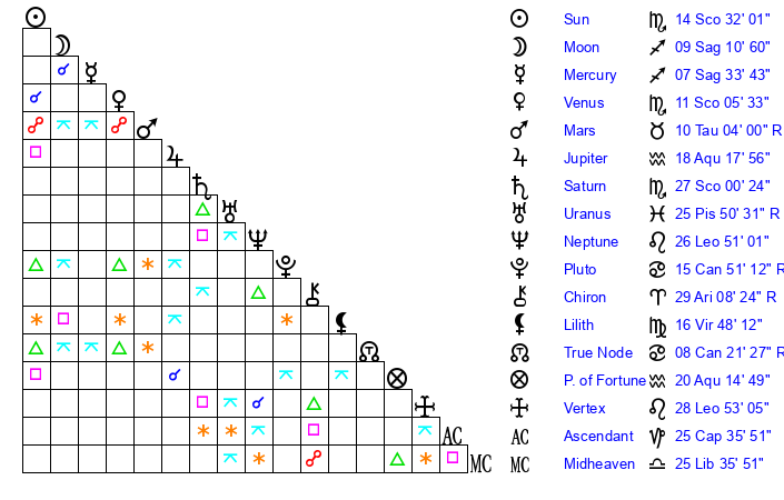 | Sun | 14 Scorpio 32 | 15 Scorpio 32 | 25 Aquarius 1 |