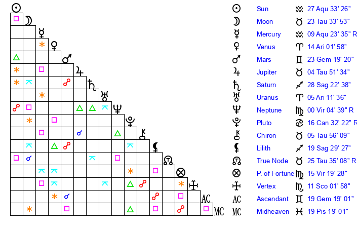| Sun | 27 Aquarius 34 | 28 Aquarius 16 | 2 Gemini 3 |