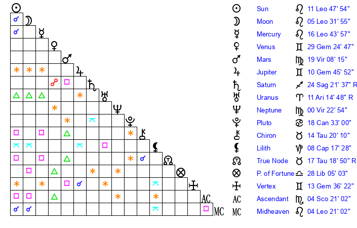 | Moon | 5 Leo 32 | 17 Sagittarius 34 | 6 Aquarius 12 |