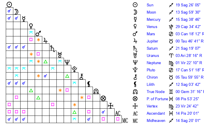 | Moon | 14 Sagittarius 0 | 18 Virgo 1 | 2 Cancer 50 |
