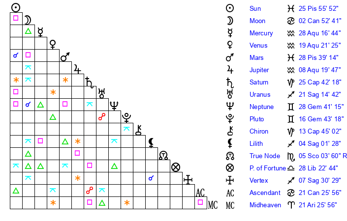 | Sun | 25 Pisces 55 | 27 Pisces 6 | 24 Cancer 51 |