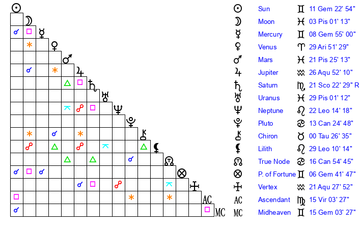 | Mercury | 8 Gemini 56 | 16 Gemini 47 | 7 Virgo 13 |