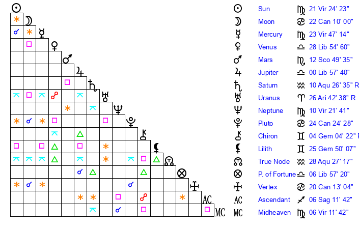 | Neptune | 10 Virgo 21 | 0 Aries 59 | 12 Virgo 23 |