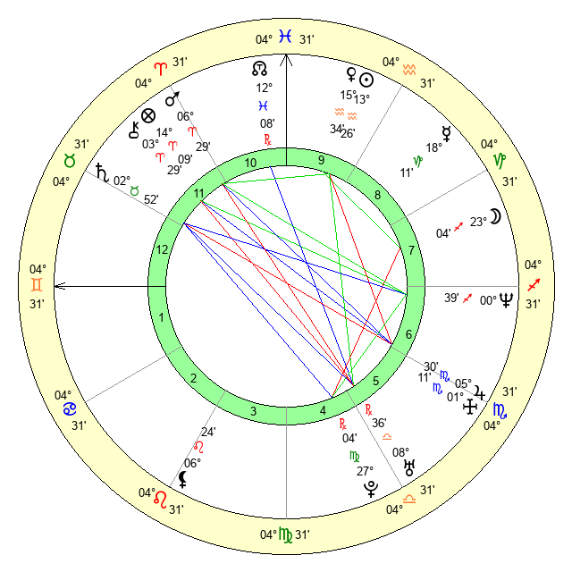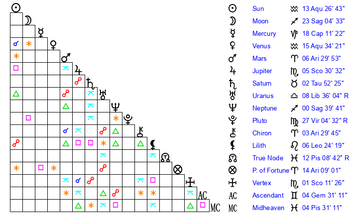 | Sun | 13 Aquarius 27 | 14 Aquarius 6 | 8 Aries 35 |