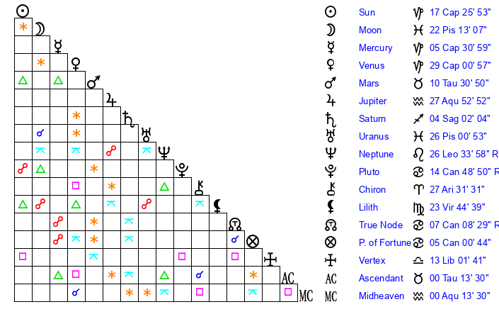 | Jupiter | 27 Aquarius 49 | 20 Cancer 20 | 20 Pisces 51 |
