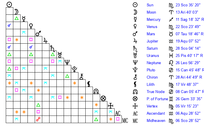 | Moon | 13 Aries 46 | 15 Libra 38 | 20 Scorpio 54 |
