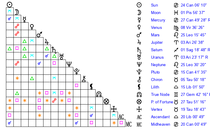 | Mercury | 27 Cancer 49 | 15 Leo 34 | 23 Scorpio 5 |