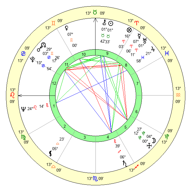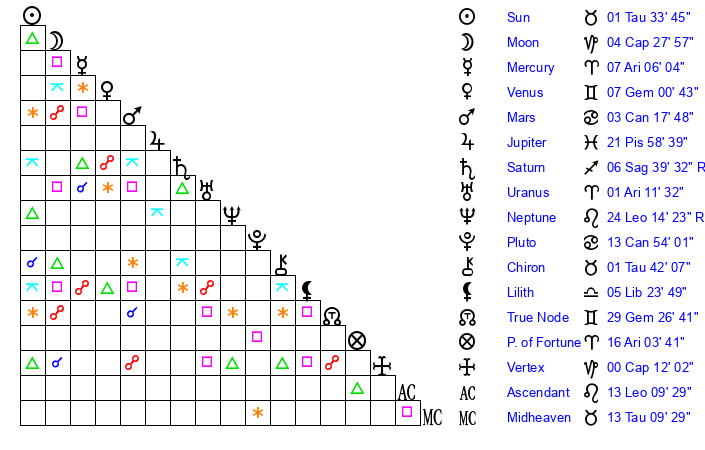 | Sun | 1 Taurus 34 | 2 Taurus 49 | 5 Leo 34 |
