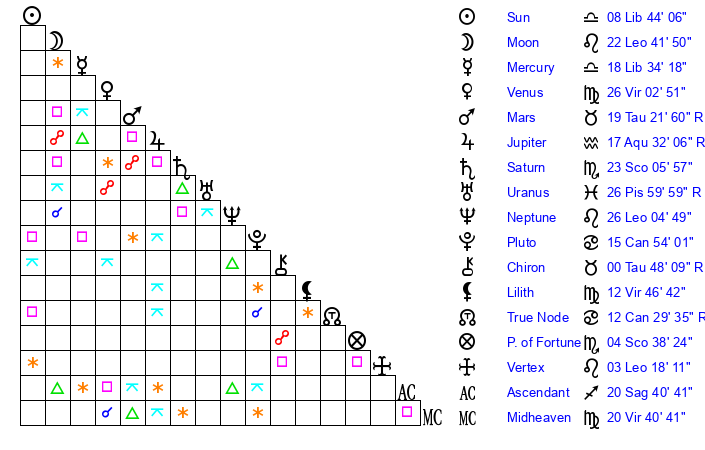 | Venus | 26 Virgo 3 | 16 Virgo 10 | 0 Aquarius 17 |