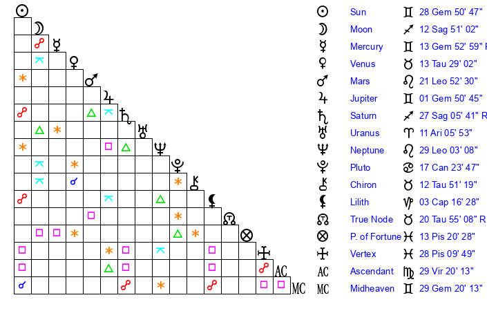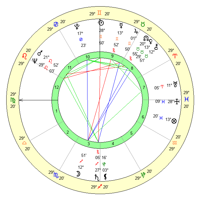 | Sun | 28 Gemini 51 | 29 Gemini 37 | 1 Libra 9 |