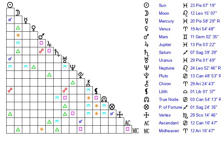 | Moon | 12 Leo 11 | 28 Virgo 52 | 5 Pisces 33 |