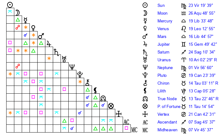 | Sun | 23 Virgo 19 | 24 Virgo 5 | 29 Sagittarius 22 |